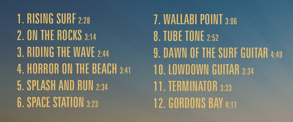 Being a fan and growing up with this style of guitar music it was a pleasure to write and record these new songs. Basically I wanted to make an album of great songs with great sounds. I hope I achieved that. Here are the 12 songs of the Dawn of the Surf Guitar album.